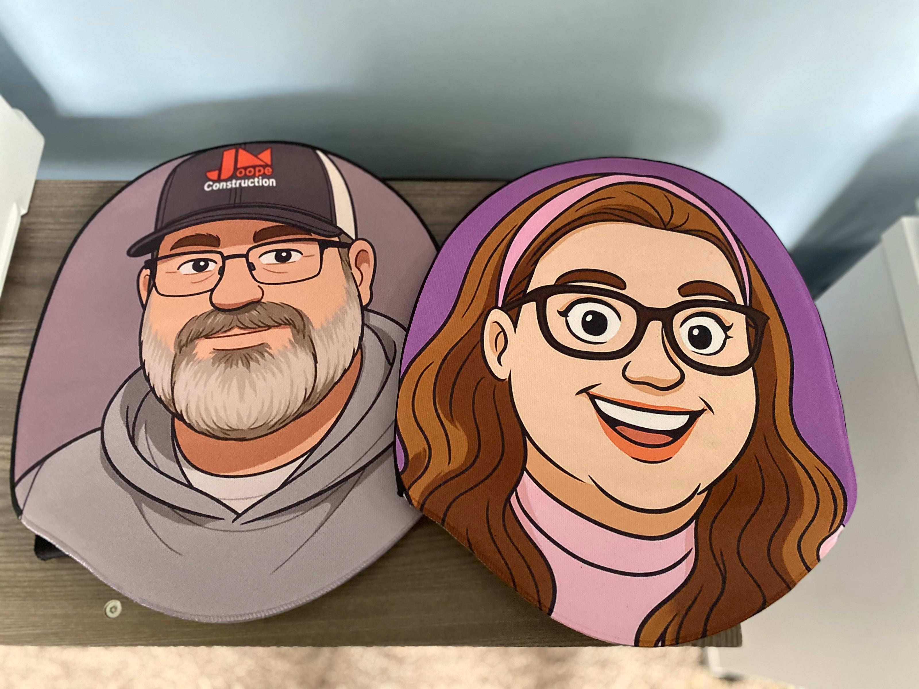 A customer sent us a cartoon of her and her husband, and we turned it into matching HeadzRest covers just for them.